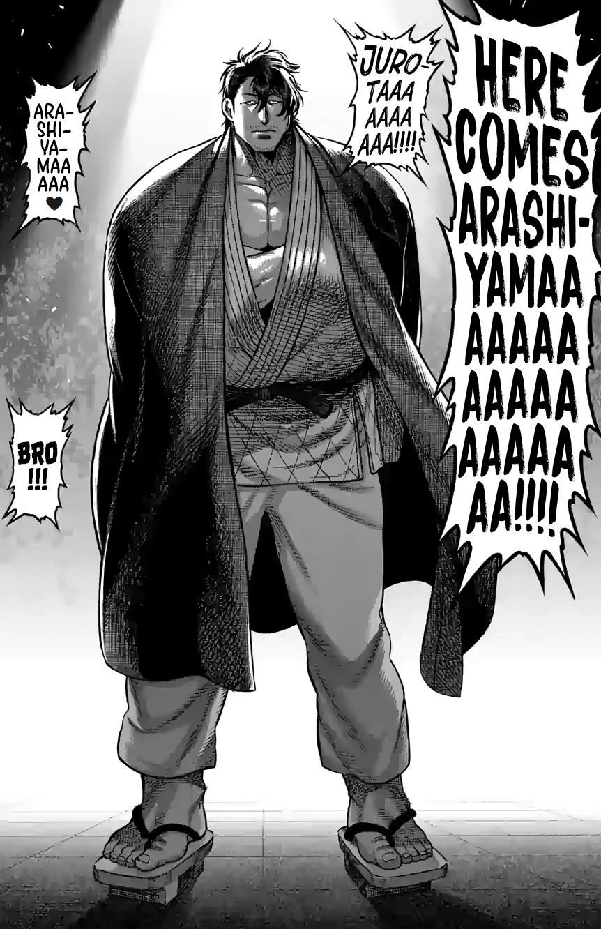 Arashiyama Jurota, también conocido como el Rey del Judo o el Rey Gentil, es uno de los Dos Reyes de Purgatorio, el otro es Rolón Donaire, y uno de los trece representantes que lucha en el Torneo de la Asociación Kengan VS Purgatorio. Jurota participó por primera vez en el Campeonato de Judo de Japón a la edad de dieciséis años. Al convertirse en campeón, Jurota ganaría el oro dos veces más antes de dejar de participar en los torneos por completo. A los diecinueve años, desesperado por su fuerza, Jurota descubrió que tenía pocas razones para luchar. Un día, Jurota vio una transmisión de un joven Meguro Masaki conquistando el Campeonato Nacional de Judo Juvenil. Reconociendo el talento y la fuerza de Masaki, Jurota decidió que lo convertiría en su rival, eligiendo ingresar al mundo del judo una vez más para esperar el día en que los dos pudieran pelear. Aunque Jurota ganó la división de clase de 100 kg del Campeonato Mundial de Judo, sus planes se vieron obstaculizados con la desaparición de Masaki después de asesinar a tres de sus cohortes, así como a su padre, Hiroki . Sin inmutarse por el poder real del niño, Jurota desapareció tanto de la escena pública de las artes marciales como del mundo para perfeccionar aún más su técnica.