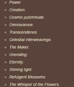 Clasificación: Dios, Deidad, Grieta, Avatar, Divinidad moribunda, Deidad hambrienta, Ser Superior, Encarnacion del Unvierso