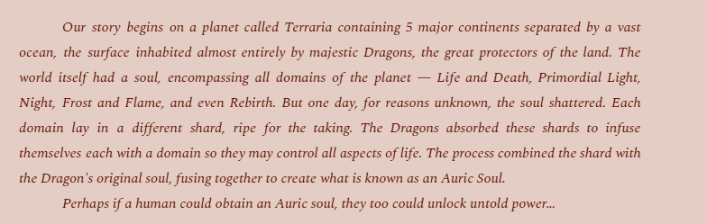 - Existencia Abstracta Tipo 1 (Arché), Transdualidad Tipo 3, Separación de la Realidad Tipo 3, Existencia Metafísica Tipo 4, Acausalidad Tipo 5, Existencia de Dimensiones Superiores: Los Dioses son descritos como entes trascendentes a toda la creación, siendo entidades absolutas por encima de todo. Son eternos e interminables, sin tener principio o final. Se da a entender también que son la manifestación divina de la vida y el cese, encarnando el principio y el final de todo. Al ser comparable a Nameless Deity debe estar también por encima del Alma del Mundo, una fuerza metafísica que engloba los conceptos y dualidades fundamentales del Universo de Terraria.