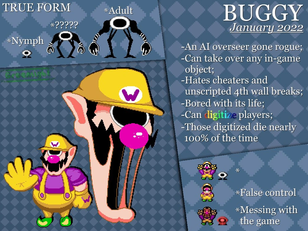 - ↑ @Greenlight_372 en X. X (25 de Noviembre de 2022): "Buggy "matures" as the game progresses, starting out in its Nymph form (small eye with legs). In some playthroughs of WA:CD at the end of the game Buggy would burst out of Wario's body to fight the last playable character.". Archivado.