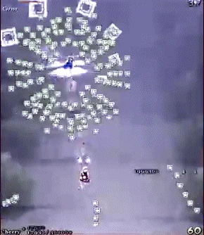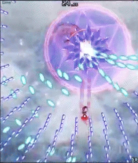 Carta de Reimu. Encierra instantáneamente el espacio circundante con una barrera mágica, una carta defensiva que repele a los enemigos cercanos y los envía a volar. Tiene una larga duración de invencibilidad segura proporcionando gran seguridad. |