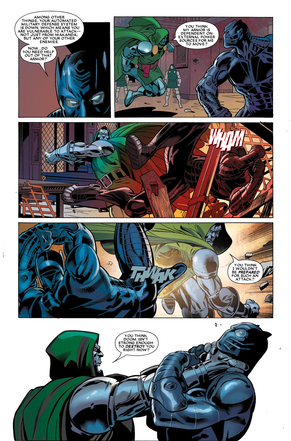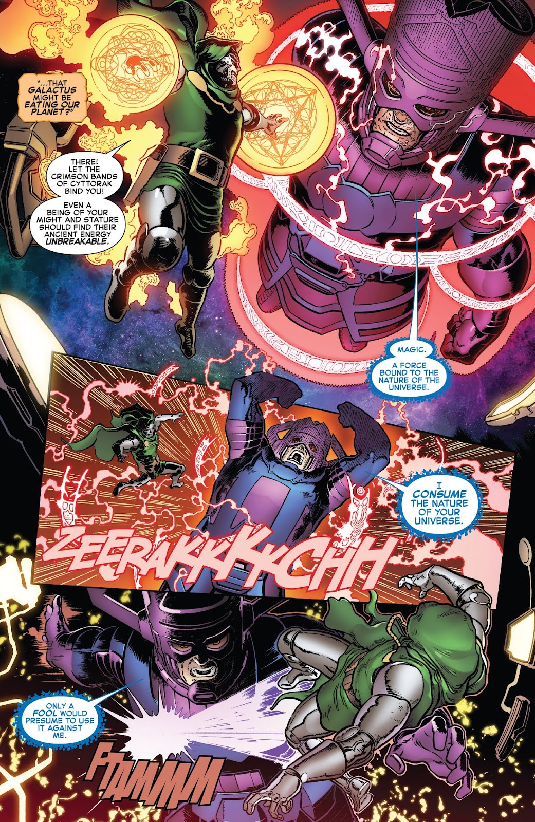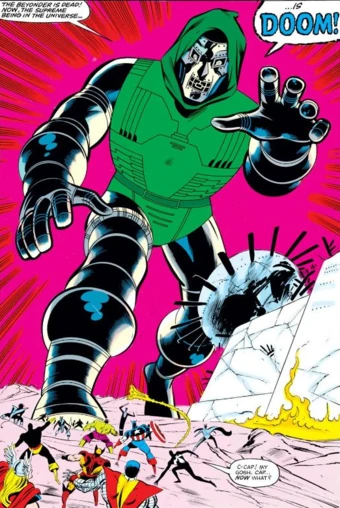 Potencia de Ataque: Nivel Universal Complejo (Destruye sin problemas a sus propios Doombots. Constantemente demuestra poder seguir el ritmo de La Mole, quien es físicamente más fuerte que Grey Hulk, el cual destruyó un asteroide dos veces más grande que la Tierra. Puede intercambiar golpes con Iron Man. Hace sangrar a Hulk, quien puede destruir universos en sus batallas y pudo romper la barrera del tiempo. Comparable a Thor, que puede recrear el Big Bang), mayor mediante Magia (Scarlet Witch menciona que su magia es más poderosa que la de ella y la de Doctor Strange. Puede invocar las Llamas de Faltine, que son mencionadas como capaces de quemar o incluso matar a los Celestiales. Luchó brevemente contra Mephisto. Mató a un Vigilante) y Preparación (Consiguió un poder más allá de un Cubo Cósmico, clamando poder destruir toda la existencia con solo un pensamiento), hasta Nivel Outerversal con Absorción (Pudo absorber a Galactus, a Nightmare, a los Vigilantes, a Franklin Richards, e incluso al Beyonder) | Multiversal Complejo Bajo (5D) a Nivel Hyperversal Alto, posiblemente mucho mayor (Posee los poderes de Galactus. Fue capaz de destruir todas las realidades conocidas y desconocidas) | Al menos Nivel Multiversal Complejo Bajo (5D), posiblemente Nivel Hyperversal Alto a Nivel Outerversal (Tiene el poder de 2 Guanteletes del Infinito) | Nivel Outerversal (Obtuvo el poder del Beyonder) | Nivel Outerversal (Mató a Doctor Strange. Derrotó fácilmente a Thanos. Se mostró superior a Ciclope con la Fuerza Fénix. Venció a Black Panther con el Guantelete del Infinito. Creó Battleworld con fragmentos del multiverso y si llega a enojarse podría destruirlo. Recibe el poder del Hombre Molécula, que es mencionado como comparable al Beyonder, e igualmente el Hombre Molécula sirve de conducto para conseguir el poder de los Beyonders)