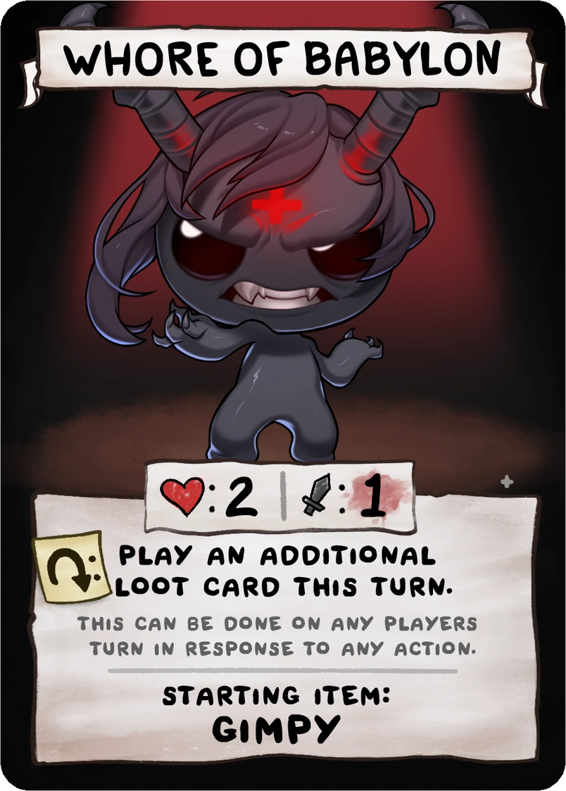 Whore of Babylon: Aumenta el daño en 1,5 y la velocidad en 0,3, mientras que Isaac tiene la mitad de un corazón rojo o menos. En Eve, el objeto se activa con un corazón rojo o menos y su multiplicador de daño aumenta de 0,75 a 1,0 cuando está activo.