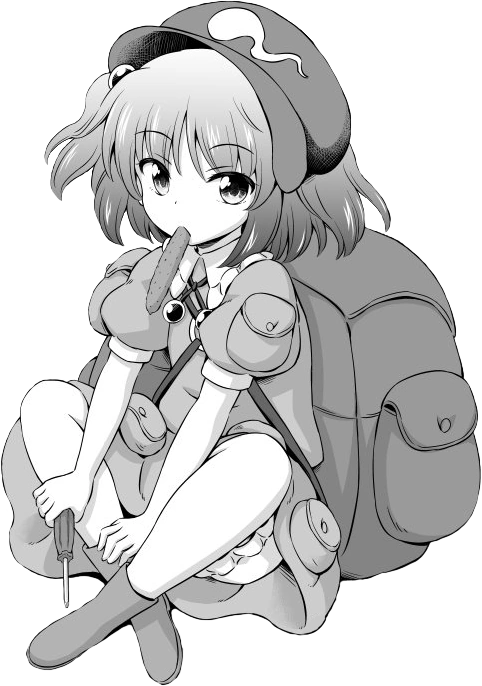 - ↑ 61,0 61,1 Touhou Gairai Ihen ~ Strange Creators of Outer World, Who's Who of Humans and Youkai in Gensokyo, Nitori Kawashiro